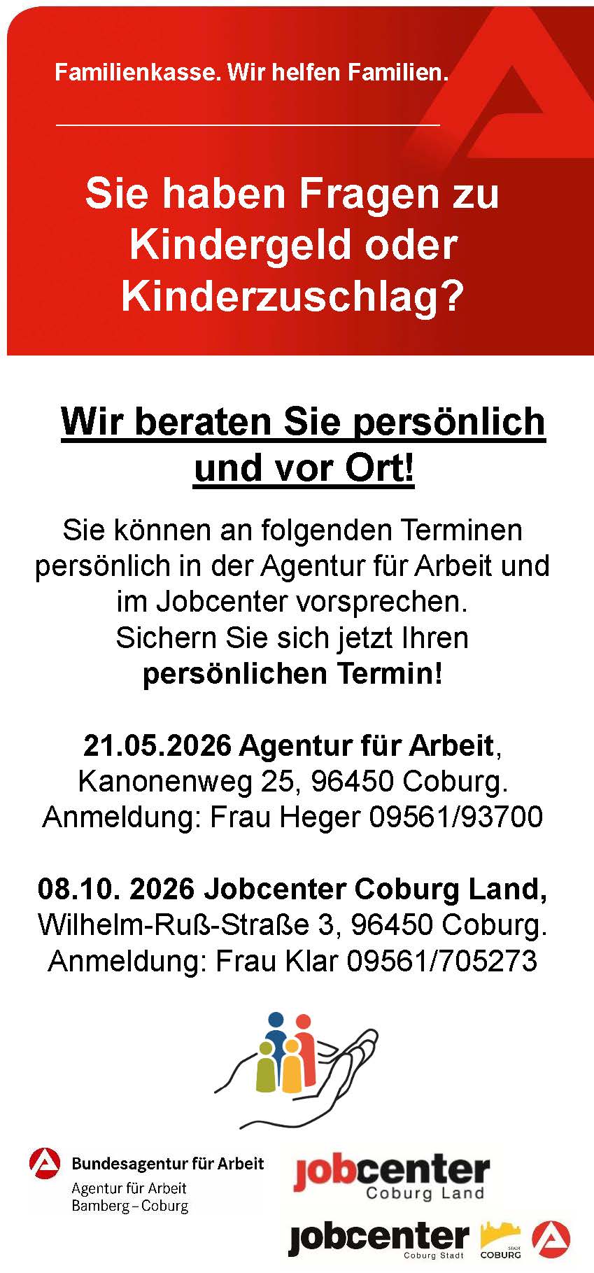 • 08.10.2026 im Jobcenter Coburg, Wilhelm-Ruß-Straße 3 Terminvereinbarung bei Frau Klar 09561/705273